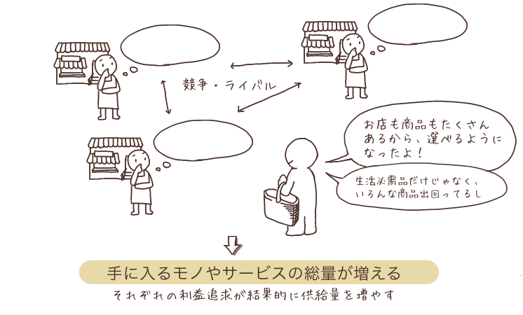 途中で淘汰されるケースもありますが、こうした競争と改善が積み重なることで、社会全体のモノやサービスの供給量と種類が増えていきます。スミスはこの仕組みを通じて「国富が増える」と考えました。